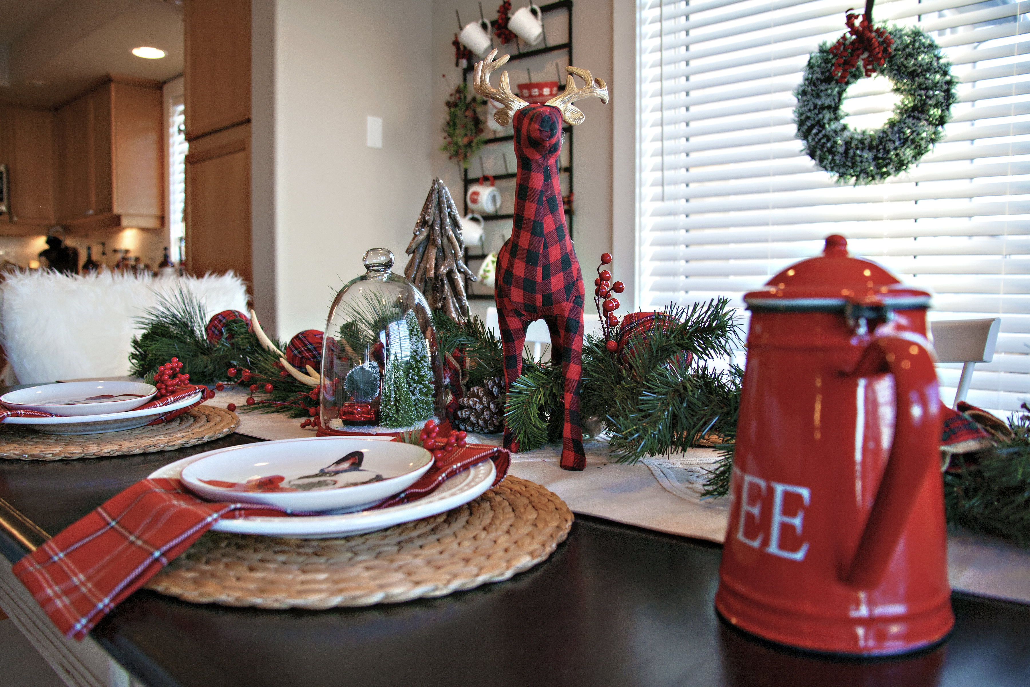 Although cooking is not one of my strong suites, decorating the Christmas table sure is! The furry white sheepskin throws were purchased for less than $20 each from Ikea (Home Sense & Jysk have something very similar.) I love how they add a modern touch to my plaid theme running throughout the table decor. The miscellaneous coffee mugs were purchased from Home Sense and local thrift stores, and hang beautifully from my Magnolia Market iron rack. The chandelier hanging above our table was purchased from a garage sale. I had Brad spray paint it black for me and hung some acorns and faux light bulbs (purchased from Home Sense) to make it a table focal point. The puppy plates are my favorite because I am a diehard dog lover (purchased at Pier One). Add a few Christmas berries and greenery, and your table is set!