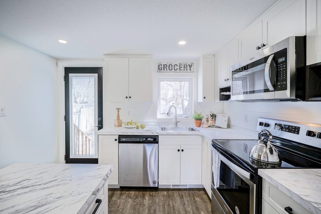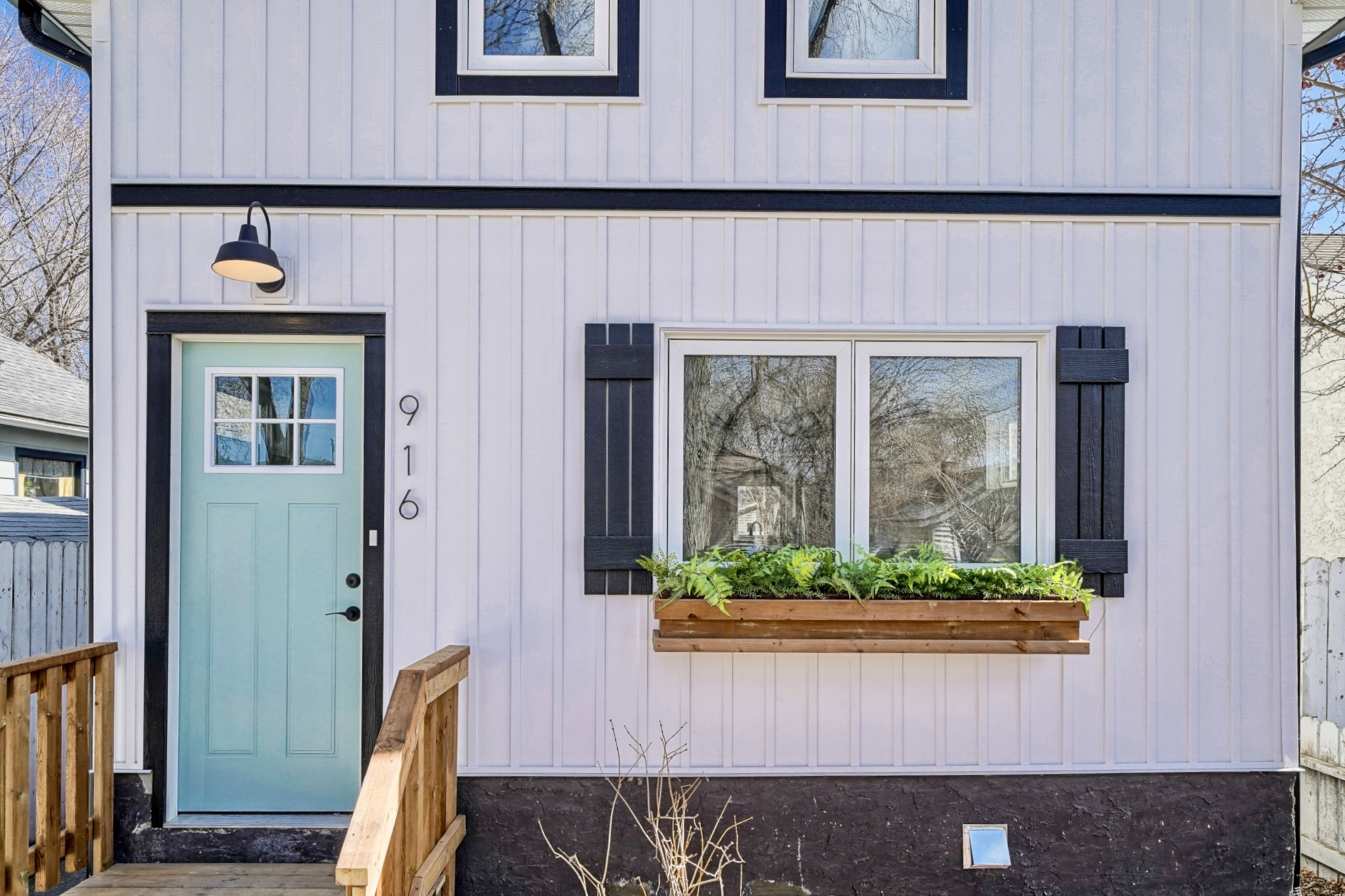 From the exterior to the interior, we gave this house “new” everything! Windows, siding, soffit & facia, kitchen, electrical, plumbing, and so on! Because the front of this home was extremely flat, I wanted to add some personality without having to re-frame anything.  We went with a white board and baton siding and added black trim and belly bands to break things up.  As you guys know, I’m a tad obsessed with window boxes so it was a must that we added one! I purchased the greenery from Home Sense and stuffed it inside the box, and TADA – we had awesome curb appeal 🙂