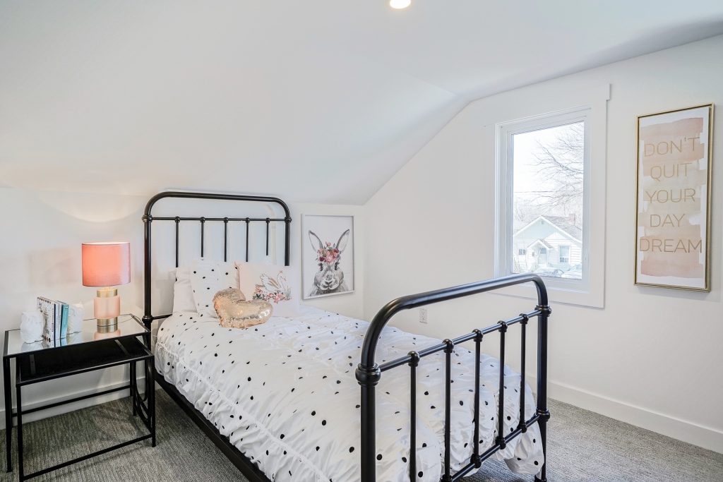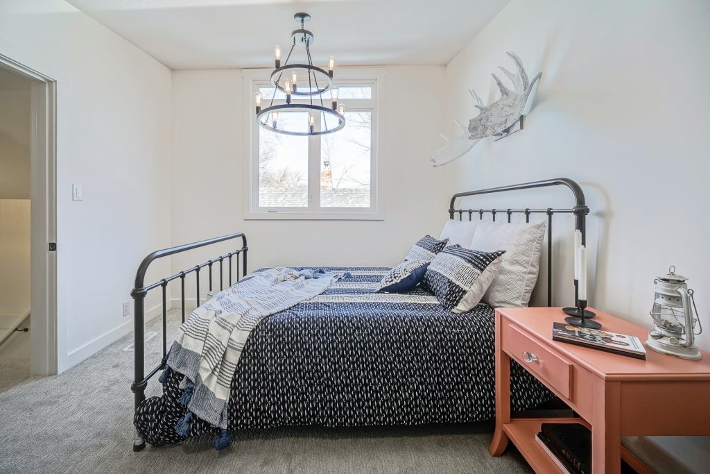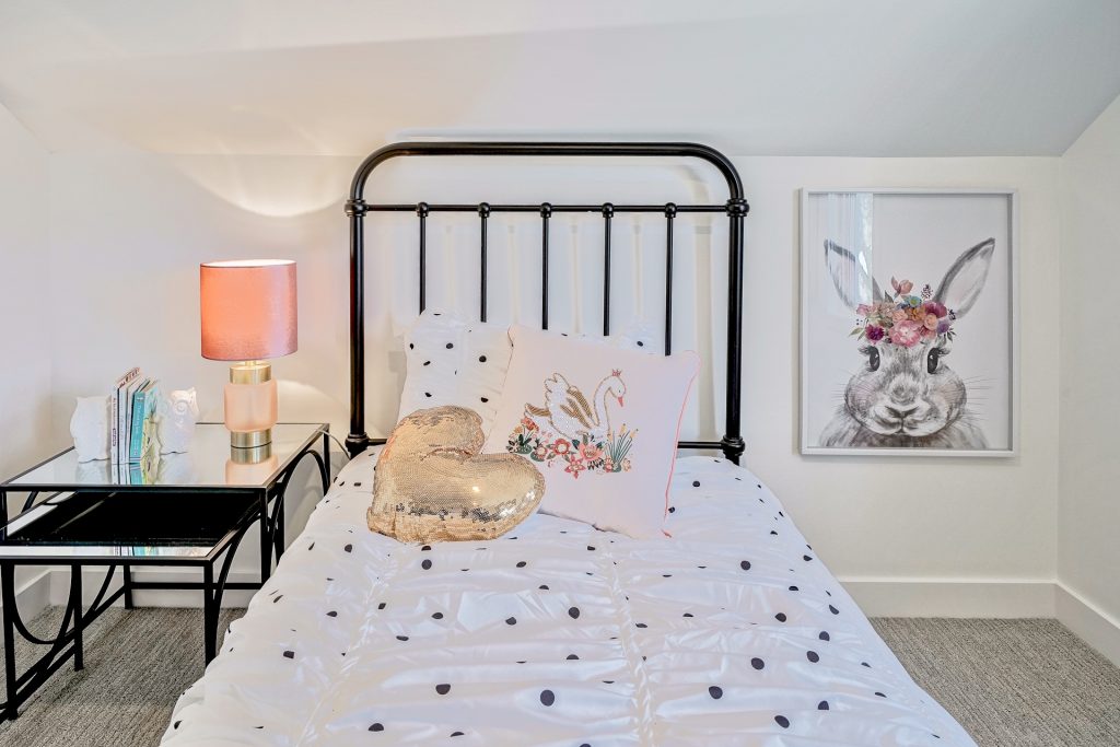 A huge thank you (as always) to the local business’s we collaborated with for staging.  Kirsten from Peach Poppy Designs painted a beautiful pink nightstand and kids armoire for the spaces.  Erin from Kinder Surprises Antiques provided us with all of the amazing vintage finds you see displayed throughout the home.  All items will be for sale at the décor sale!